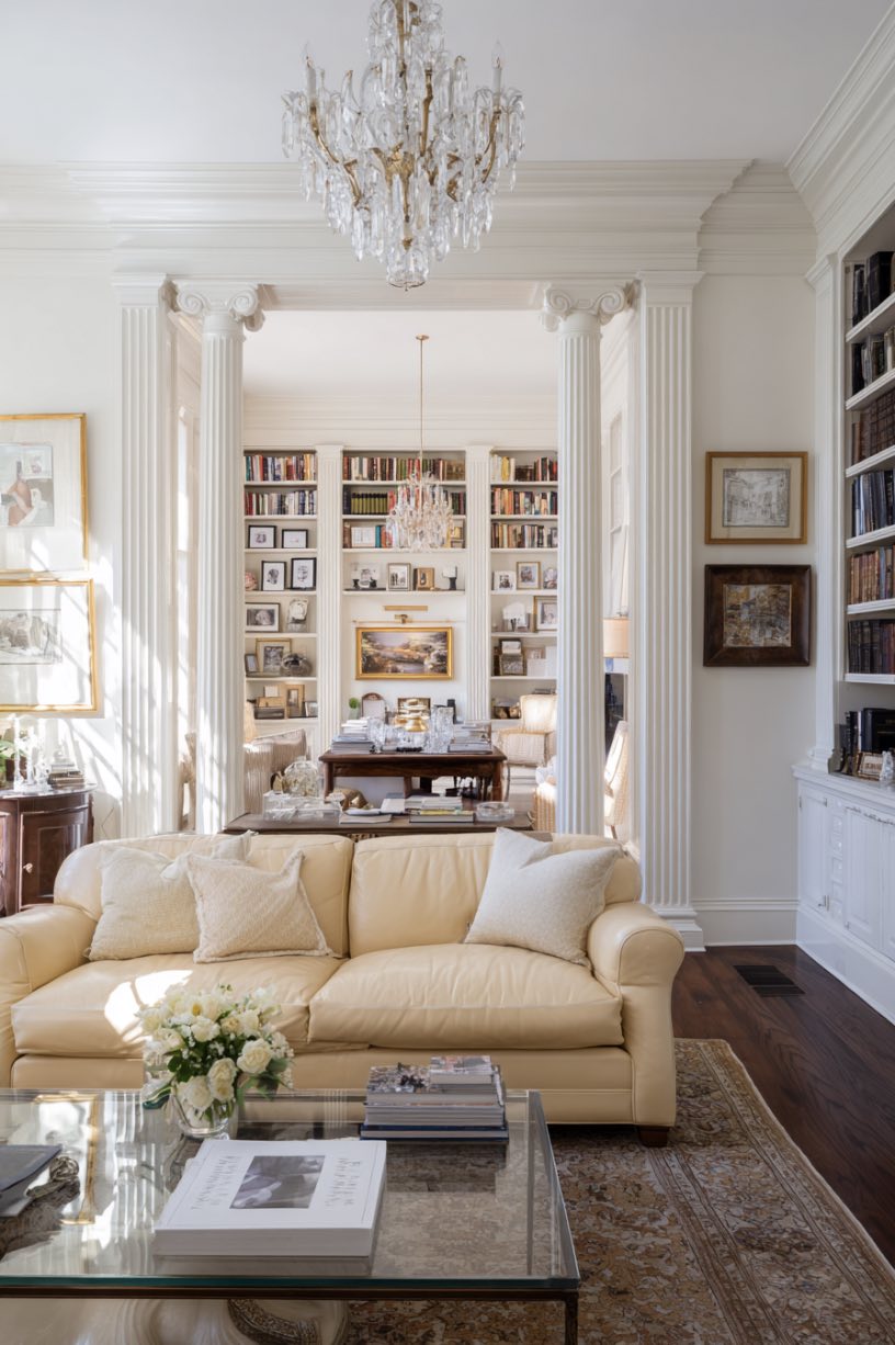 This bright living room feels like stepping into a timeless classic. The white walls and warm wood floors create a clean backdrop for two cream leather sofas, perfectly framed by tall columns that lead to a charming library filled with books and memories.