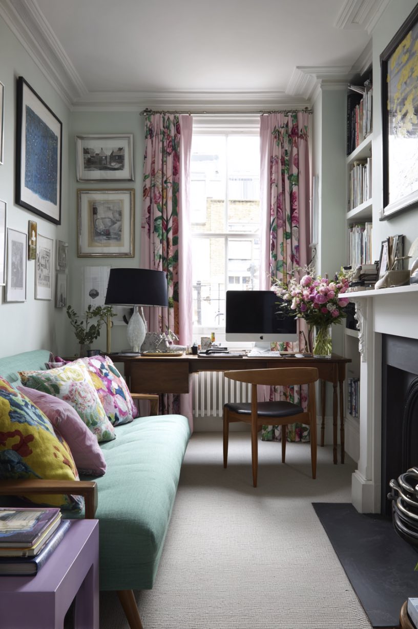 This small London home office nails the mid-century modern look with clean white and soft green walls setting a calm tone. The purple side table and black lampshade add just the right pop of color, while pink curtains soften the natural light beautifully.